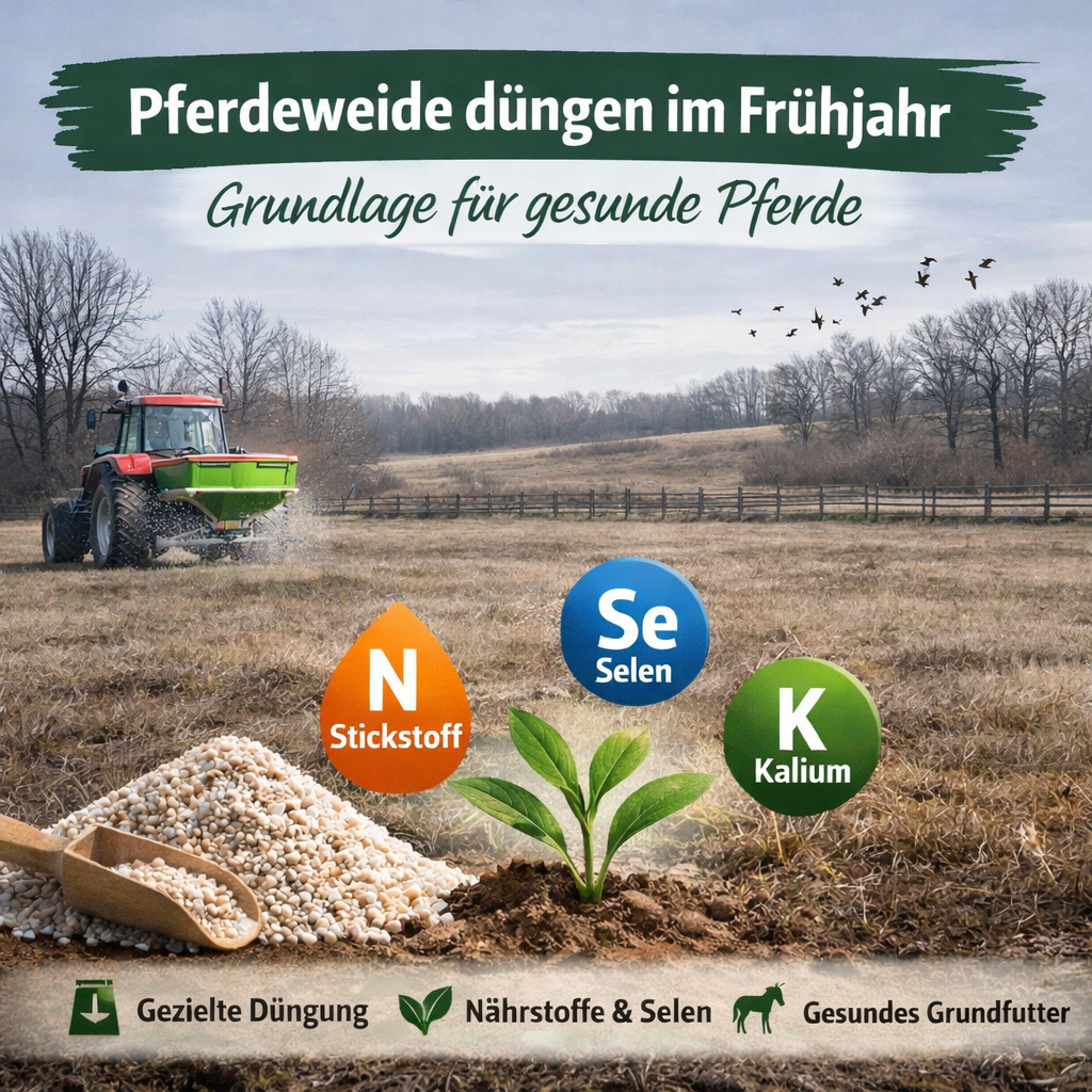 Eine gezielte Frühjahrsdüngung der Pferdeweide bildet die Grundlage für stabile Grasnarben und hochwertiges Grundfutter. Neben einer maßvollen Stickstoffversorgung spielt auch die bedarfsgerechte Zufuhr von Mineralstoffen und Spurenelementen wie Selen eine wichtige Rolle für eine ausgewogene Nährstoffkette.